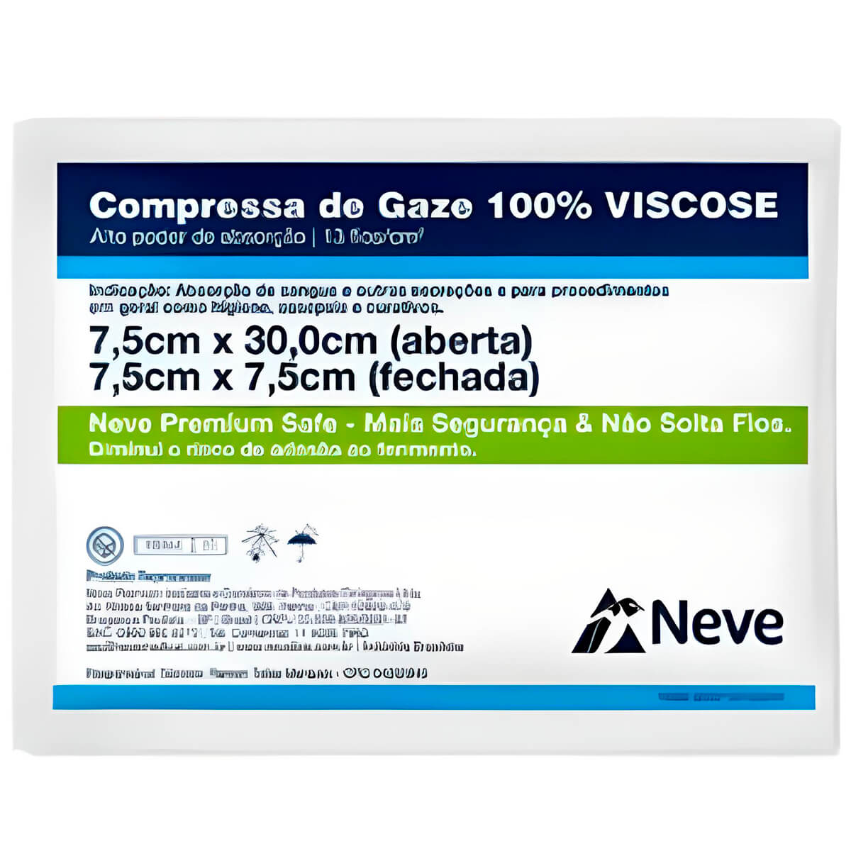 As Compressas de Gaze Estéril Neve são confeccionadas em tecido 100% algodão, neutro, macio, com alto poder de absorção, alvejado e purificado, apresentando-se isento de sujidades, impurezas, substâncias gordurosas, amido, corantes corretivos e alvejantes ópticos. Podem ser forcecidas com ou sem filamento radiopaco.