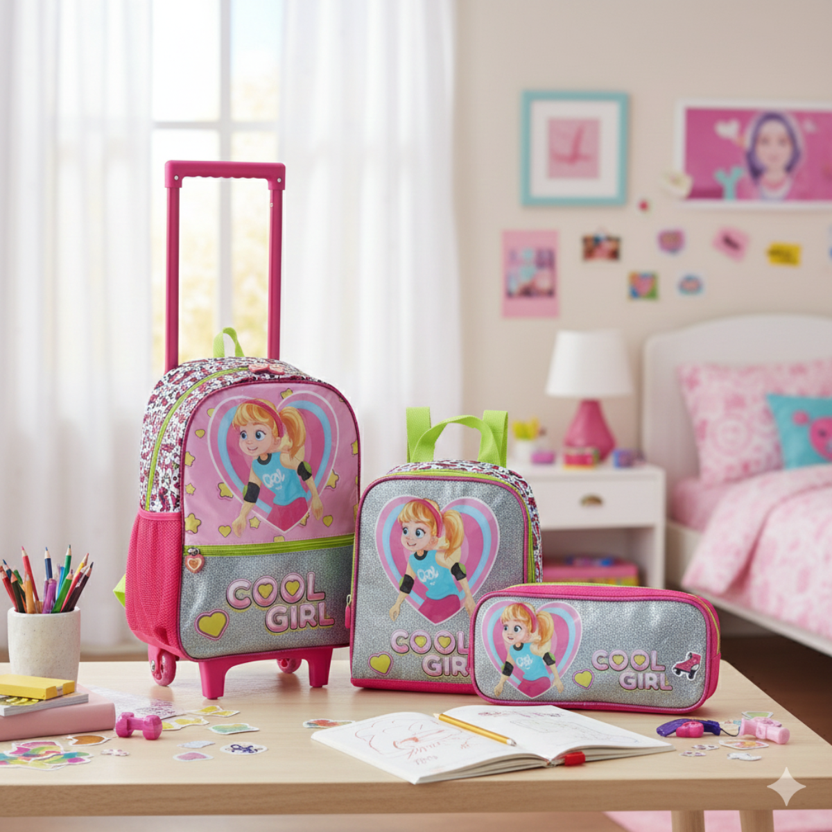 Kit Escolar Cool Girl - Mochila de Rodinhas, Lancheira e Estojo